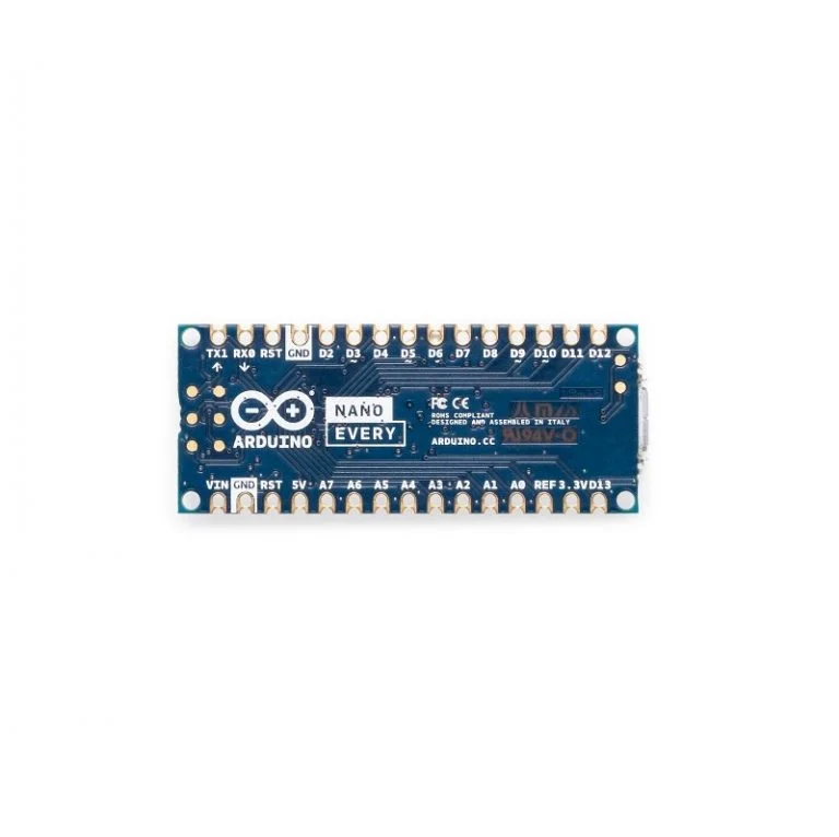 The Nano Every is an Original Arduino’s 5V compatible board in the smallest available form factor: 45x18mm! The Arduino Nano Every is an evolution of the traditional Arduino Nano board but features a lot more powerful processor, the ATMega4089. This will allow you to make larger programs than with the Arduino Uno (it has 50% more program memory), and with a lot more variables (the RAM is 200% bigger).