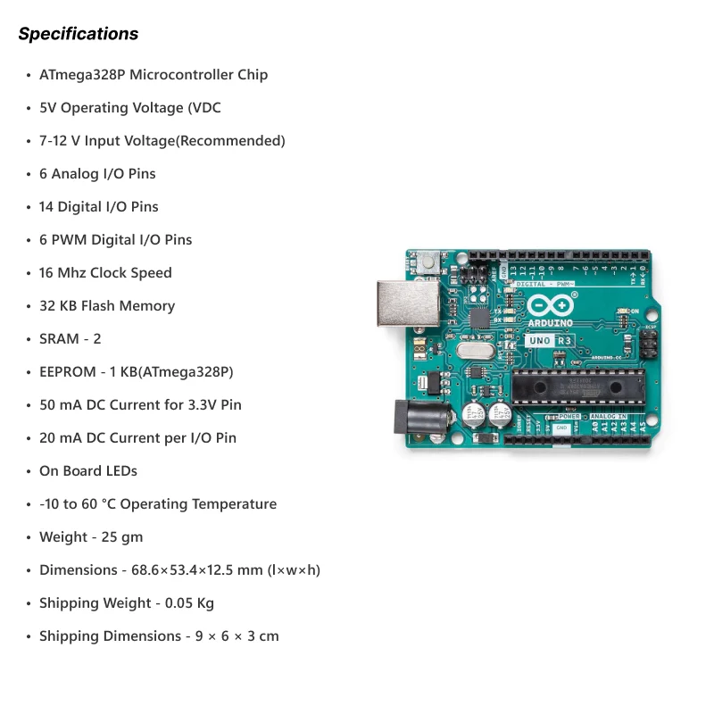 This Arduino Uno is an original microcontroller board from Arduino officials based on the ATmega328P. It has 14 digital input/output pins (of which 6 can be used as PWM outputs), 6 analog inputs, a 16 MHz quartz crystal, a USB connection, a power jack, an ICSP header and a reset button. It contains everything needed to support the microcontroller; simply connect it to a computer with a USB cable or power it with an AC-to-DC adapter or battery to get started.. You can tinker with your UNO without worrying too much about doing something wrong, worst case scenario you can replace the chip for a few dollars and start over again.